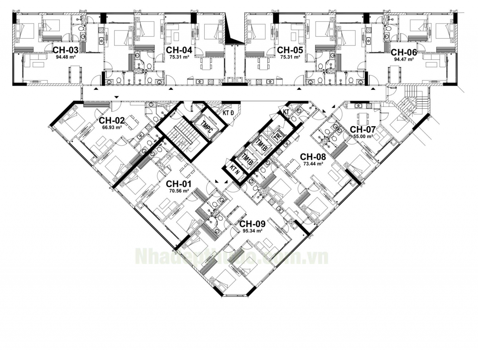 • Căn 3PN: 93,69 - 97,38m2 (51 căn)