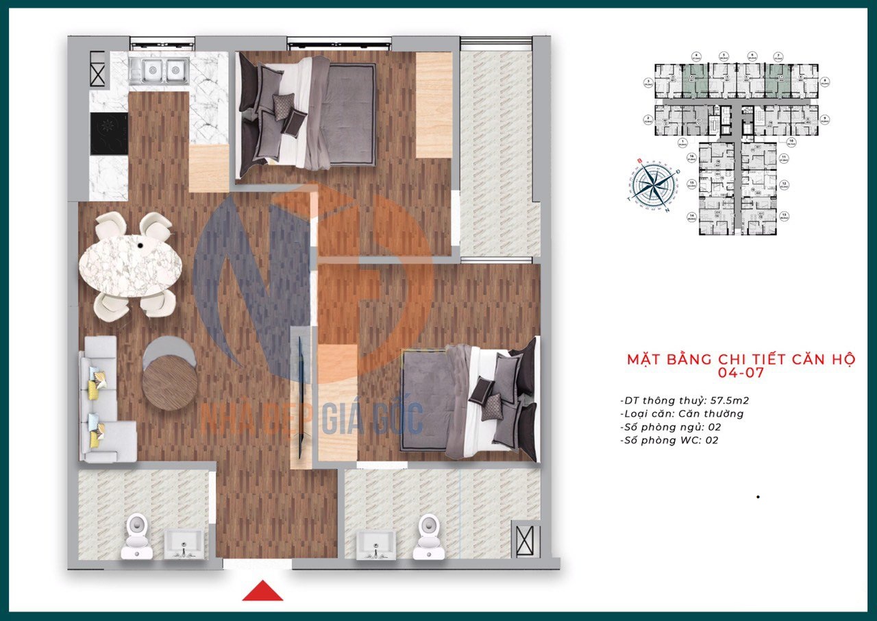 - Căn 2 phòng ngủ: 52m - 54m - 57m - 62m - 65m2.