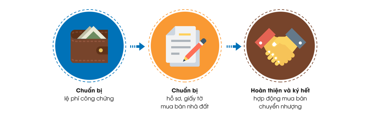Sau khi bạn đã chuẩn bị tất cả các thủ tục giấy tờ, cả hai bên mua bán hay chuyển nhượng cần phải đến cơ quan công chứng nơi có tài sản được mua bán chuyển nhượng để thực hiện các thủ tục ký kết hợp đồng. Tai đây, cơ quan công chứng sẽ soạn thảo hợp đồng và chứng nhận theo quy định của pháp luật, và xuất làm 4 bản chính.